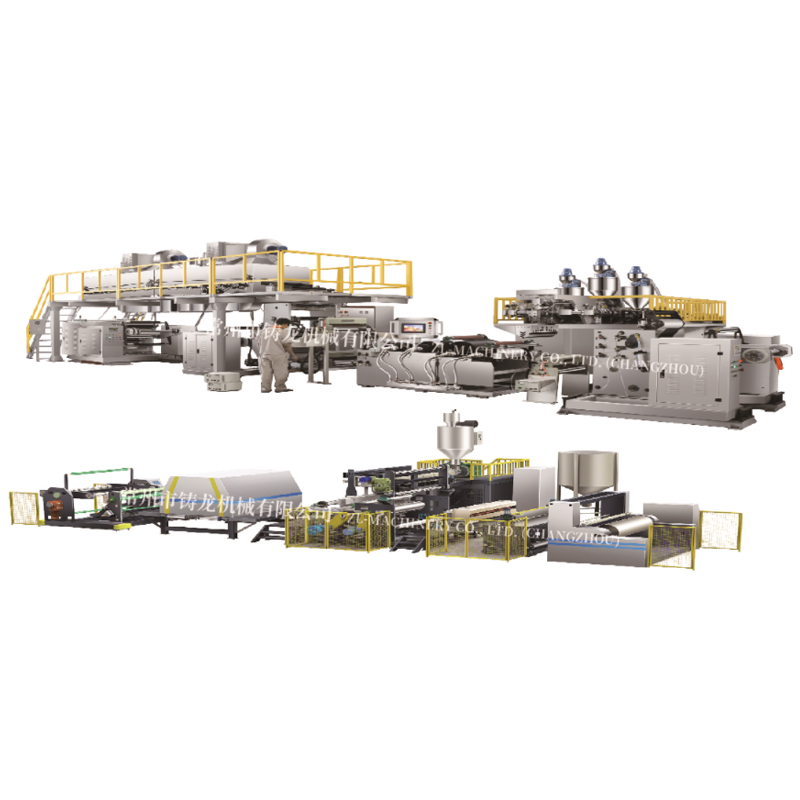 鑄龍ZLX-LM擠出淋膜復合機組系列,利用PE/EVA/PP/TPU/POE等熱塑材料的擠出工藝,對基材進行單/雙面覆膜或多層復合,形成具有多種功能的復合制品。該系列設備擁有多種模塊化結構,通過模塊組合,可以實現低速、中速、高速、超薄、超高克重淋膜復合功能,適用淋膜基材涵蓋薄膜、無紡布、珍珠棉、發(fā)泡卷材、紙、紡織品、編織布、針刺布、水刺布、網格布、功能隔膜、金屬箔、鍍鋁膜等。通過單機、雙機、多機以及單層/共擠、預熱、預涂、復合等功能選配,可以滿足食品、外包裝、裝飾品、建材、農業(yè)、光電、車船航天功能材料等領域的廣泛需求。